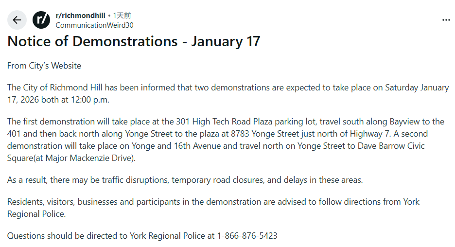 如果你今天下午需要去超市、接送孩子、看医生,或路过Yonge/16街/Bayview/401高速公路一带,建议提前出门,或者干脆换路线。
