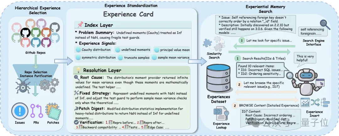 该框架并未采用简单的检索增强(RAG)路径,而是提出了一套完整的“经验精炼”机制,将杂乱的GitHub数据转化为智能体友好的结构化记忆,并结合了Deep Research的思想提出了“Experiential Memory Search”策略,实现了从历史经验中提取可复用修复逻辑的闭环。