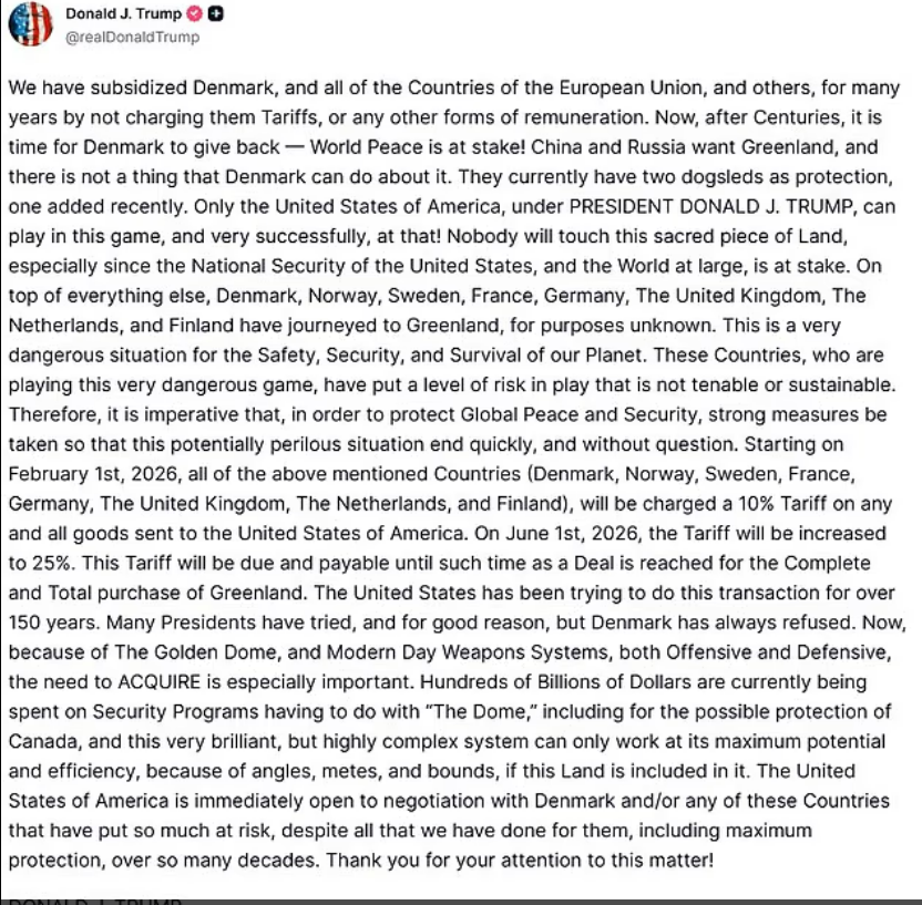川普周六上午在其社交平台 Truth Social 发文称,自2月1日起,英国、丹麦、挪威、瑞典、法国、德国、荷兰和芬兰向美国出口的“任何及所有商品”都将被征收 10%的关税。川普表示,这项关税将持续执行,直到美国与丹麦达成协议,完成对格陵兰岛的“购买”为止。