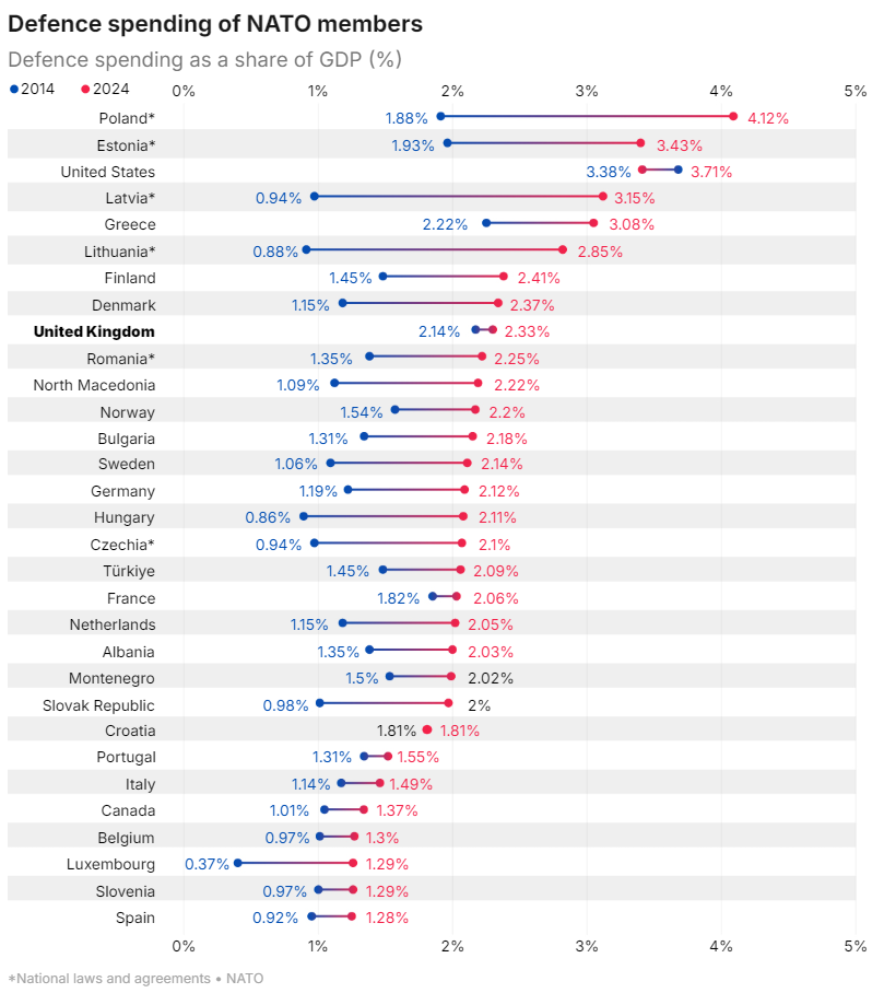 长期以来,川普频频批评北约盟友在军费问题上“搭美国便车”,称美国多年来“补贴了整个欧盟”。目前北约成员国被要求至少将GDP的2%用于国防,而在川普持续施压下,北约去年峰会已同意到2035年将目标提高至5%。