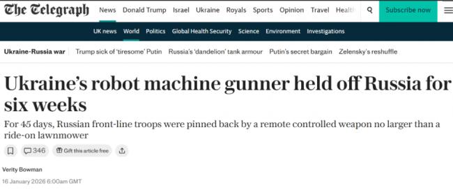 1月16日,《今日电讯报》发表其乌克兰前线记者的战场一线观察报告称,45天内,一把不比骑乘割草机大小的遥控机器人,仅靠一挺勃朗宁机枪,便抵挡并消灭了欲图进攻波克罗夫斯的1个连队的俄罗斯军队的进攻。