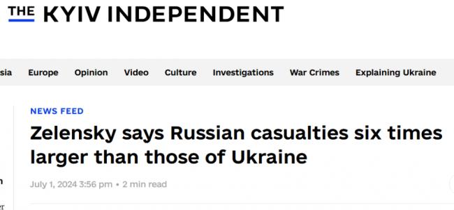 在报道残酷的乌东战况时,基辅独立报曾经报道过,乌克兰总统泽连斯基于6月30日接受《费城询问报》采访时表示,在抵御俄罗斯的入侵战争中,俄军的人数比乌克兰多得多,其巨大伤亡也容易通过军事动员得到补偿。但乌克兰更关心自己的人民,没有、也不能派出对等的兵力去战场肉搏,但经过乌克兰军事工业的努力,无人机、机器人越来越多地代替乌克兰战士去一线杀敌。已经将之前的俄乌军人伤亡比4比1提高到了6比1。