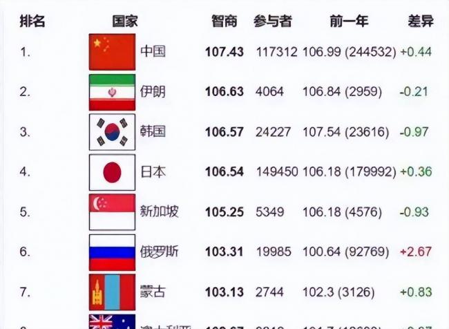最近有一份全球平均智商排名,数据来自国际在线测试平台,参与者超过上百万。结果令人惊讶,中国的分数高达107.19,远远甩开了美国和俄罗斯。美国的分数为99.74,勉强没有过百,俄罗斯则是103.16,刚好勉强保持在前列。这种差距不容忽视,它反映了不同国家在教育和生活环境上的差异。