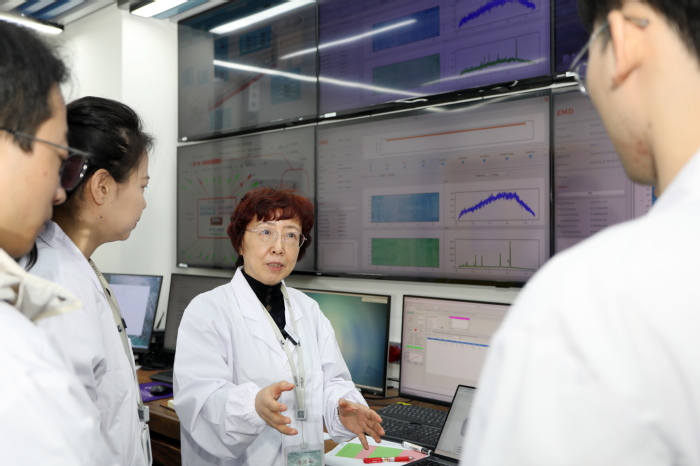 张丽娟(左三)与团队成员探讨相关技术问题。张友炳 摄
