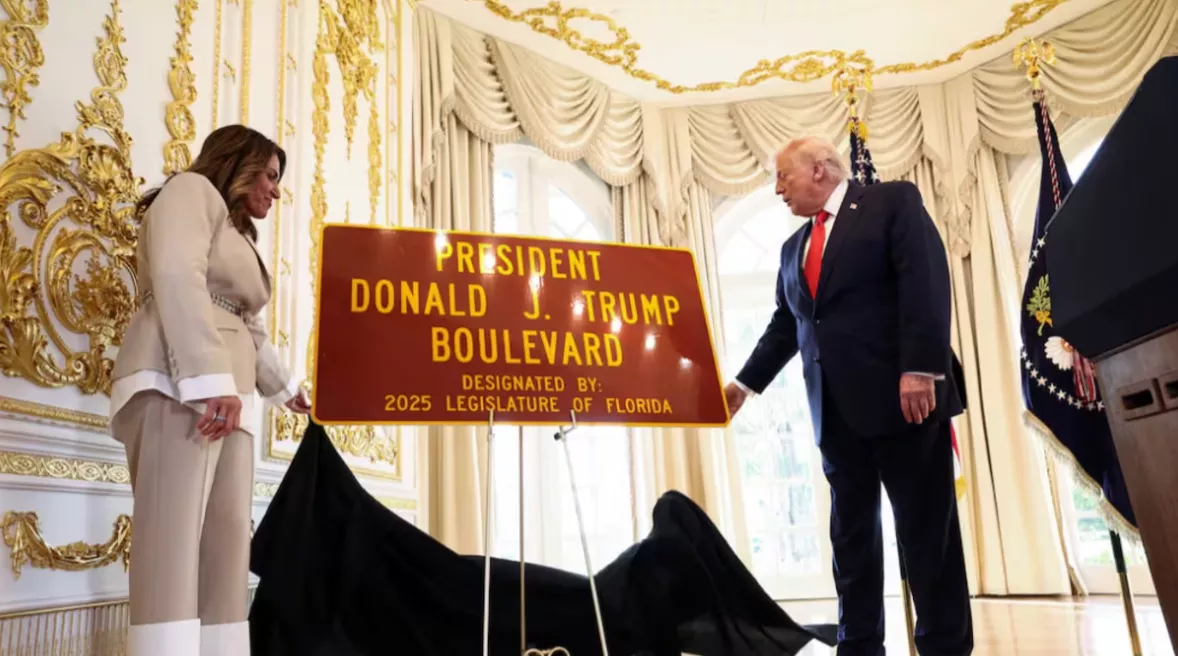 美国总统特朗普出席了佛罗里达州棕榈滩一条道路的更名仪式。该道路位于其私人俱乐部兼住所海湖庄园(Mar-a-Lago)附近。自今年1月再次入主白宫以来,以特朗普名字命名的建筑、项目和相关倡议不断增加,此次道路更名被视为最新一例。