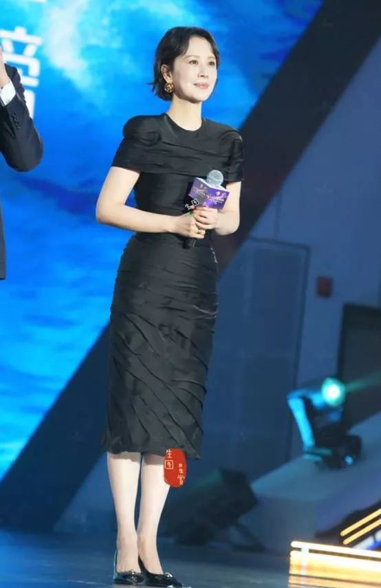 同样是一身黑色,海清这条黑色褶皱纹理的长裙却格外凸显身材,脖颈纤细、曲线窈窕。