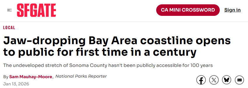 位于马林县(Marin)和索诺玛县(Sonoma)交界处的一段未开发的加州海岸线,时隔一个世纪首次正式向公众开放。