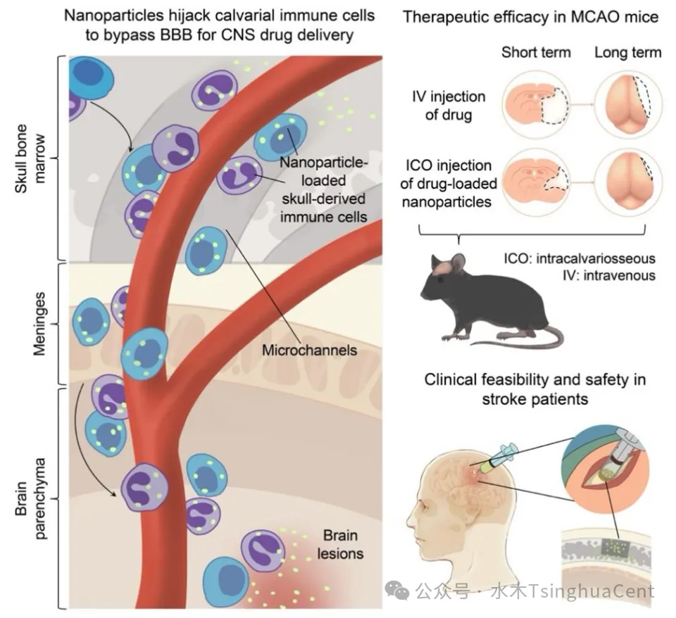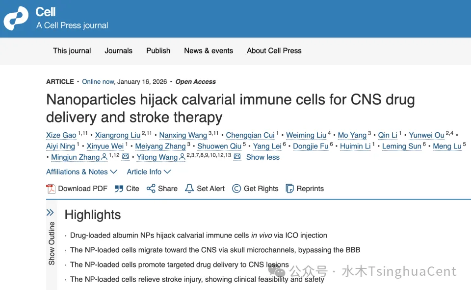 这项于1月16日发表在《细胞》(Cell)上的研究,由清华大学生物医学工程学院张明君教授团队与首都医科大学附属北京天坛医院王伊龙教授团队联合完成。他们开创性地利用“颅骨骨髓免疫细胞”作为载体,成功绕过坚固的血脑屏障,为中枢神经系统疾病(如脑卒中)的药物递送提供了全新且高效的解决方案。