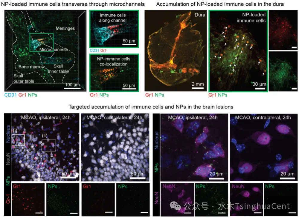 借助先进的三维成像技术,研究人员清晰地观察到,在脑卒中模型小鼠中,“颅骨免疫细胞微纳机器人”通过颅骨-脑膜通道向中枢神经系统的迁移显著增强,并最终在发炎的脑膜和脑卒中的核心病灶区高度富集。这意味着,这些运输车能精准感知病理状态,并主动向“炎症火线”集结。