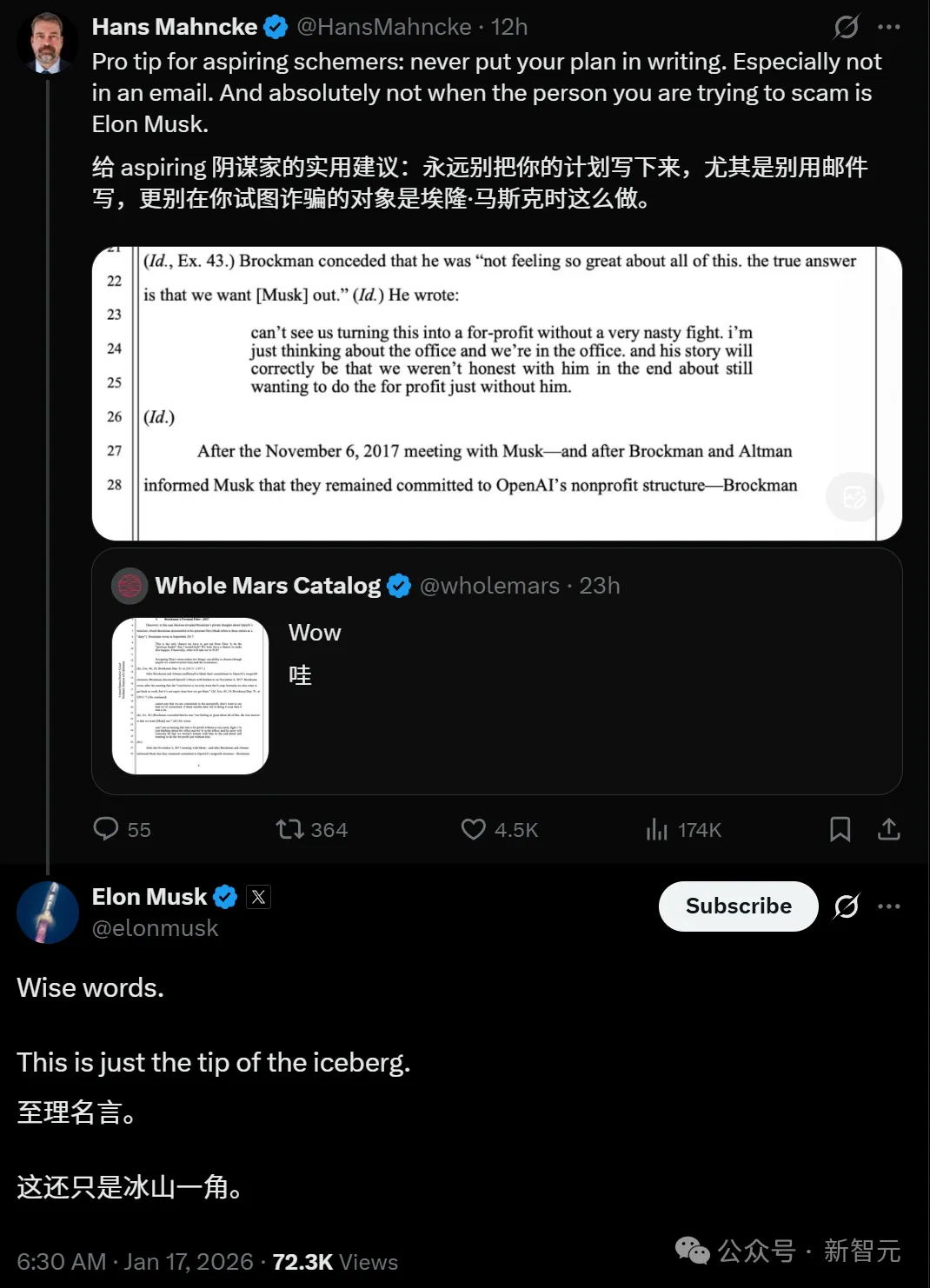 文章直接甩出了大量2017年前后的内部邮件、短信记录,甚至还有联创Greg Brockman的私人日记摘录——这些都是在诉讼过程中被法院解封的证据。