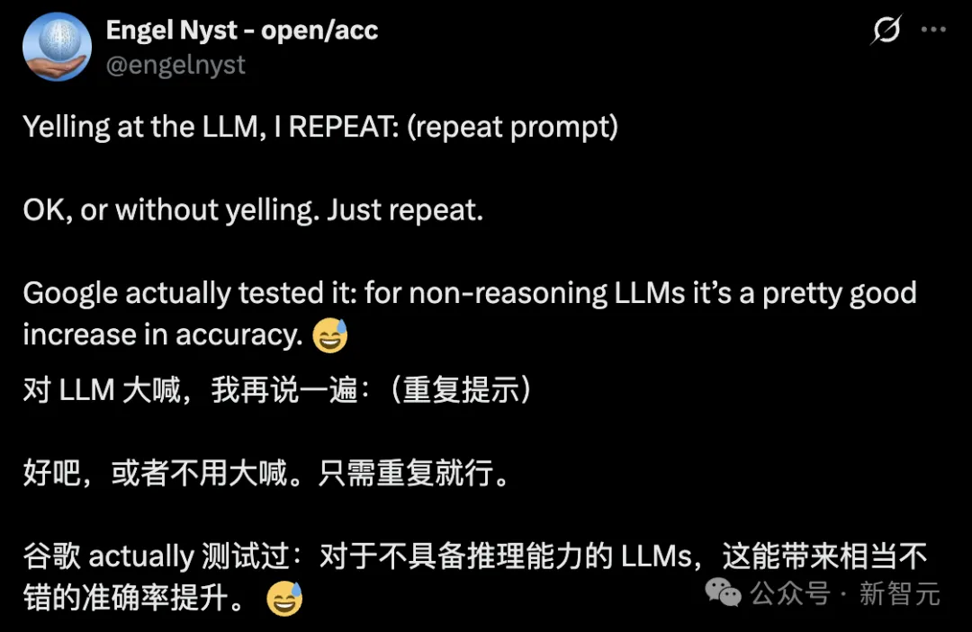 而「提示词重复」这个技巧,本质上就是利用黑客思维给这个系统打了一个补丁。