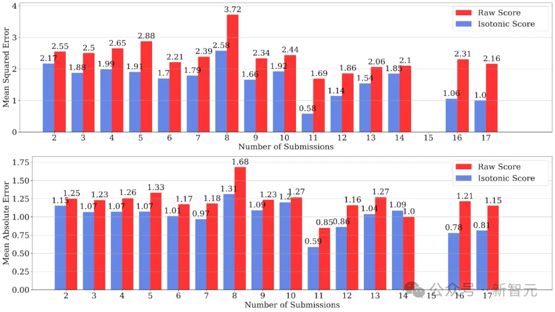 ICML2023实验数据分析:在不同投稿数量下,蓝色柱状图(自评级校准分)的误差显著低于红色柱状图(评审员原始分)