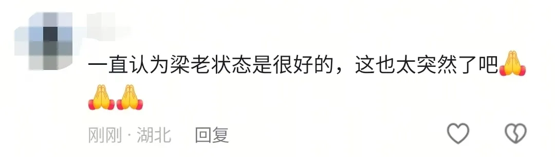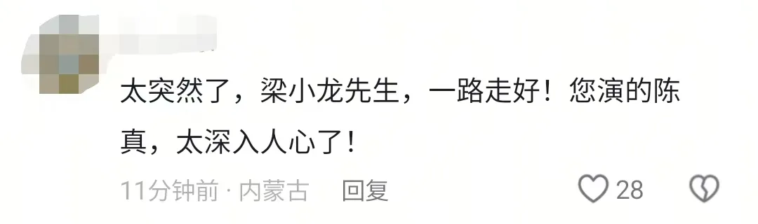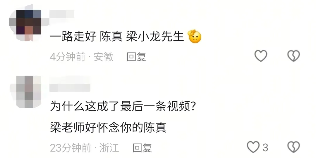 梁小龙近年长居内地,活跃于抖音、小红书等社交平台,经常分享生活日常、功夫心得,以及与朋友聚会的欢乐时光,深受粉丝喜爱。在他离世的消息传出后,许多网友在其账号下留言悼念: