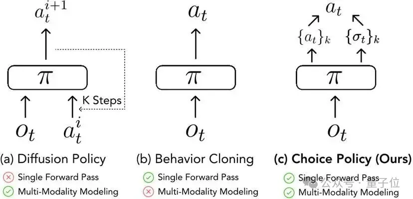 要么“太迟钝”:比如“扩散策略”虽然能想到多种动作,但需要反复计算,延迟极高,根本跟不上实时操作需求(比如插盘子时错过最佳对准时机)。