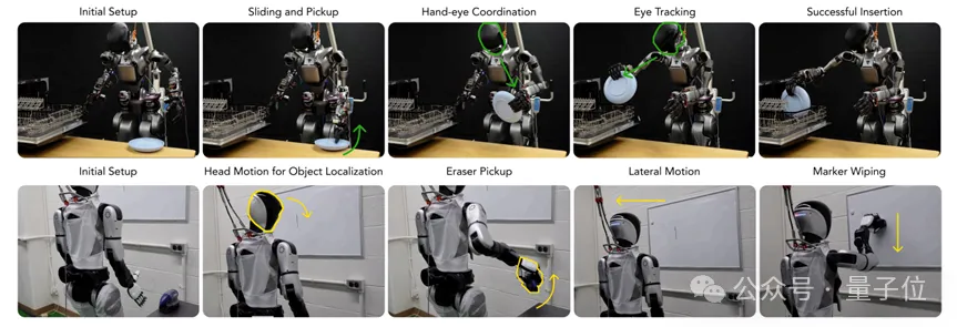 像使用洗碗机、移动擦黑板这类“长时连续任务”,需要机器人同时协调头部(定位目标)、双手(抓握操作)、腿部(移动平衡),实现类似人类“眼到手到、脚步稳健”的状态。
