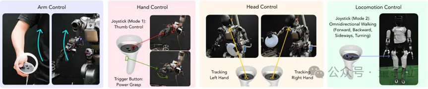 团队把机器人的全身控制拆分成4个“傻瓜式”模块,操作员只需用VR手柄就能轻松操控,无需专业技能: