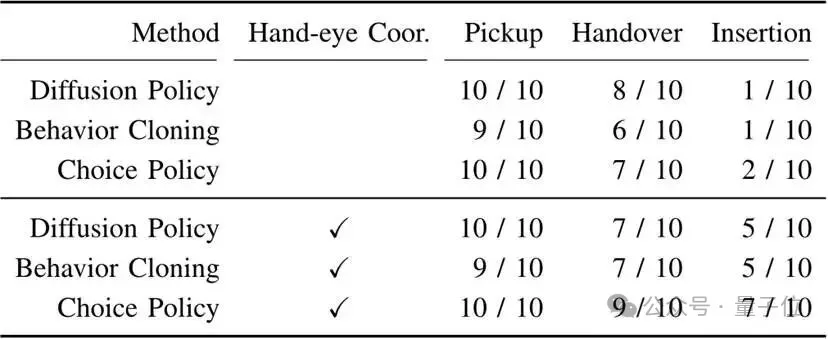 有手眼协调时:Choice Policy表现一枝独秀——抓取成功率100%、手递手成功率90%、插入成功率70%;而传统“行为克隆”插入成功率仅50%,“扩散策略”因延迟高,插入成功率也只有50%。