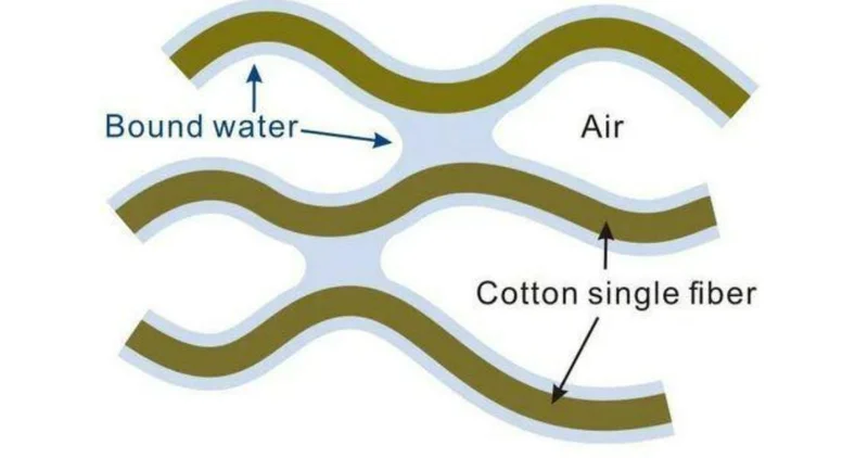 残留在纤维素之间的结合水内部也有比较强的氢键作用力,在自然干燥的过程中,水分越来越少,而水分子之间因为这个作用力“拉在一起不愿意放手”,这就会把棉纤维也拉近聚集到一块。