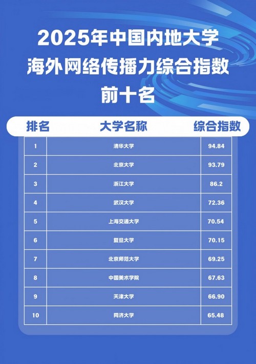 《2025中国大学海外网络传播力建设报告》显示,2025年的中国193所大学海外传播力综合指数排名前十名大学依次为:清华大学、北京大学、浙江大学、香港科技大学、香港大学、香港理工大学、香港城市大学、武汉大学、台湾大学、上海交通大学。中国内地大学排名前十位依次是:清华大学、北京大学、浙江大学、武汉大学、上海交通大学、复旦大学、北京师范大学、中国美术学院、天津大学、同济大学。