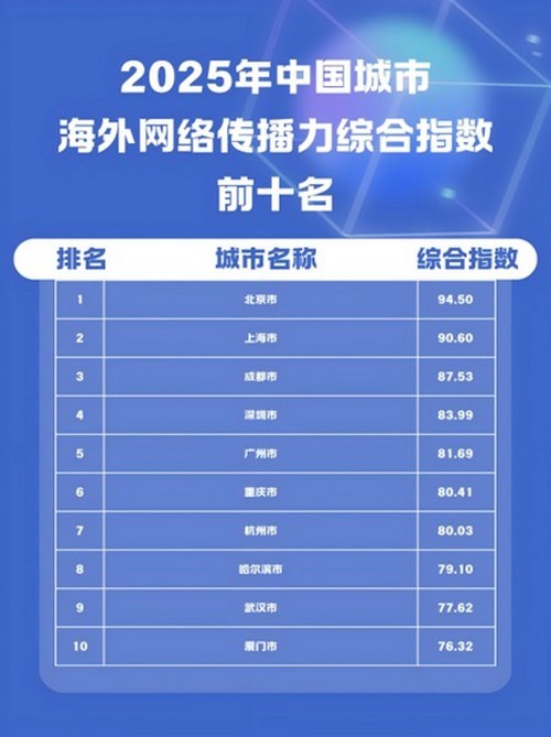 《2025中国城市海外网络传播力建设报告》显示,2025年中国338座城市(自治州、地区、盟)海外网络传播力综合指数前十名依次是:北京市、上海市、成都市、深圳市、广州市、重庆市、杭州市、哈尔滨市、武汉市、厦门市。与2024年相比,2025年度中国城市海外传播力综合指数增长较快城市:信阳市、乌兰察布市、益阳市、锡林郭勒盟、吉安市、玉溪市、六安市、安顺市、泰安市、淮北市。与此同时,在2025年综合指数排名前20名城市中,名次上升幅度最大的3个城市为:拉萨市、太原市、苏州市。