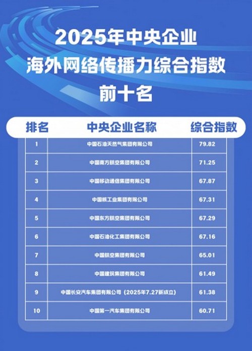 《2025中央企业海外网络传播力建设报告》显示,2025年100家中央企业海外传播力综合指数得分前十的中央企业依次为:中国石油天然气集团有限公司、中国南方航空集团有限公司、中国移动通信集团有限公司、中国核工业集团有限公司、中国东方航空集团有限公司、中国石油化工集团有限公司、中国航空集团有限公司、中国建筑集团有限公司、中国长安汽车集团有限公司、中国第一汽车集团有限公司。