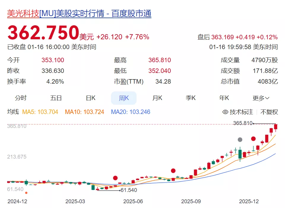 而相关公司股价已然进入“狂飙”模式。例如行业龙头美光科技,自去年下半年起股价便如坐火箭般蹿升,从100美元出头涨至超360美元,半年多时间翻了3倍,总市值达到4083亿美元。