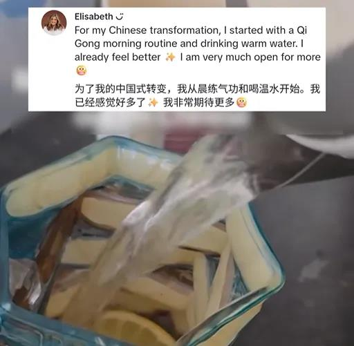 一时之间,外国网友开始喝热水、煮养生茶、拿起保温杯,彷佛集体进入养生觉醒期; 甚至还有人总结了“中式生活清单”:在家穿拖鞋、每天早上跳50下、一天多次喝温水或花茶。 “#美国人开始认同中式生活#”话题也登上微博热搜。