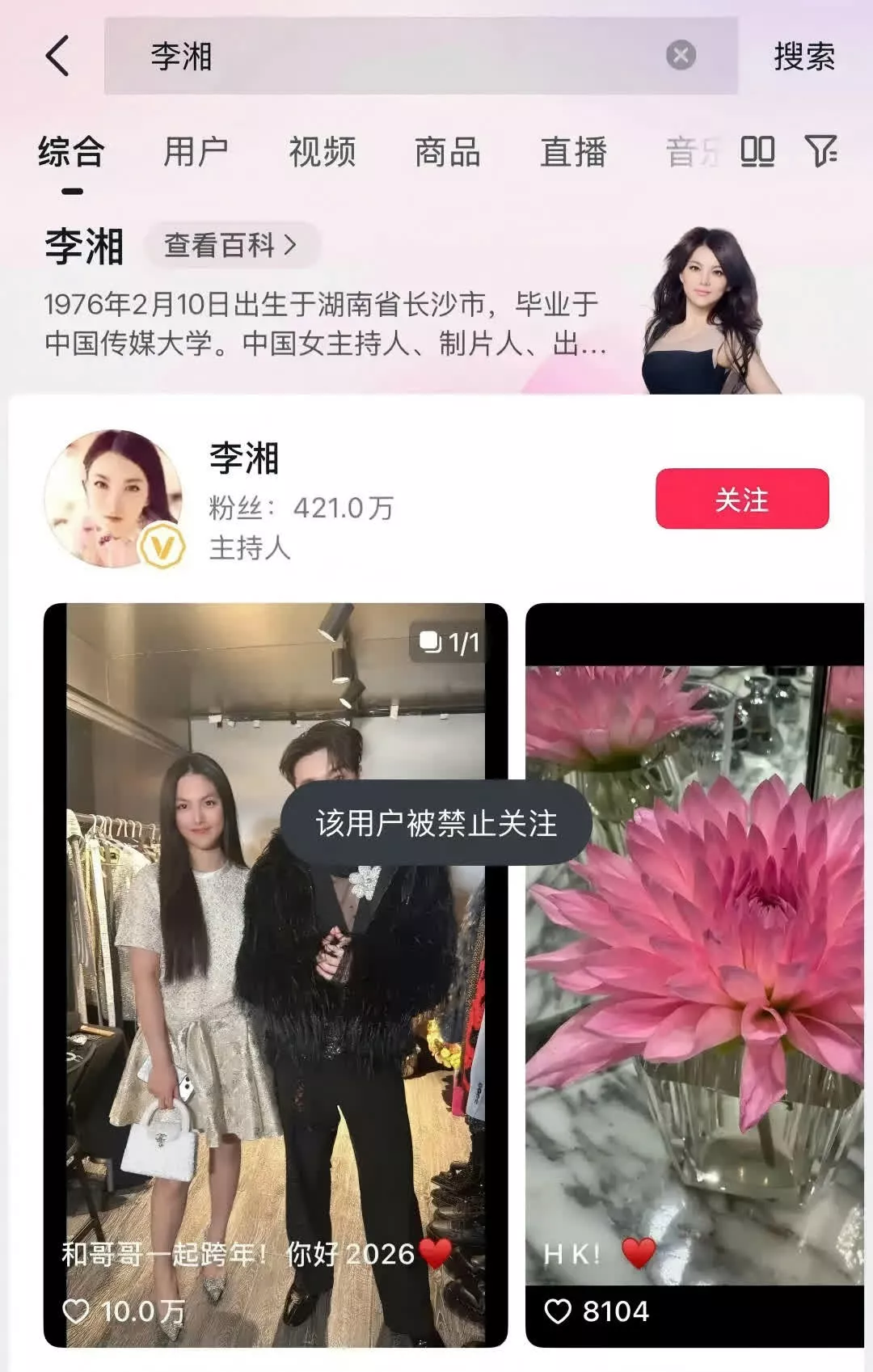 以李湘的抖音帐号为例,页面显著标示“该用户被禁止关注”,若点击“关注”按钮,后台会发送即时提示“该用户被禁止关注”。李湘最新一条抖音于2025年12月31日发布,内容为女儿王诗龄(Angela)与艺人张艺兴一起跨年的图片。