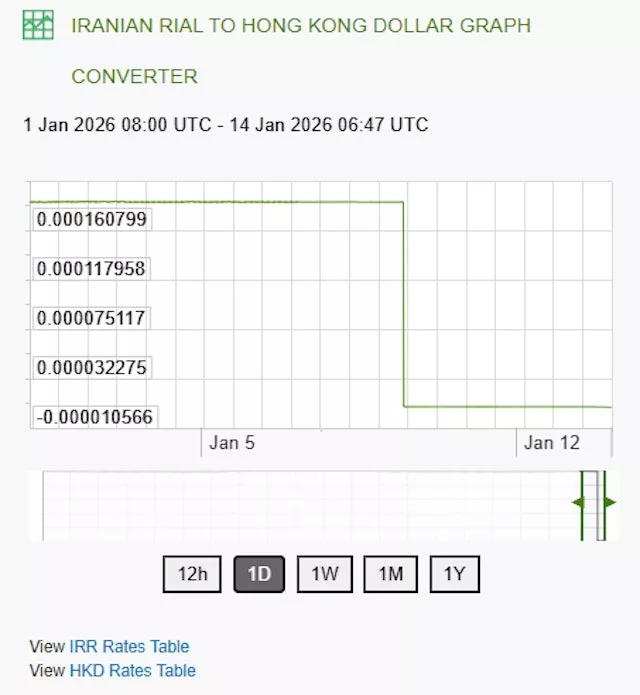 统计数据显示,自2026年1月9日以来,伊朗里亚尔兑港元暴跌至1:0.000007。(数据来源:X-Rates)