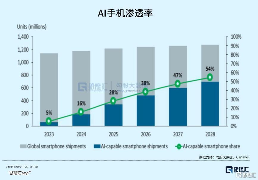 根据Canalys的数据,2023年全球AI手机渗透率仅5%,2025年就飙升至28%,预计2027年将达到54%。