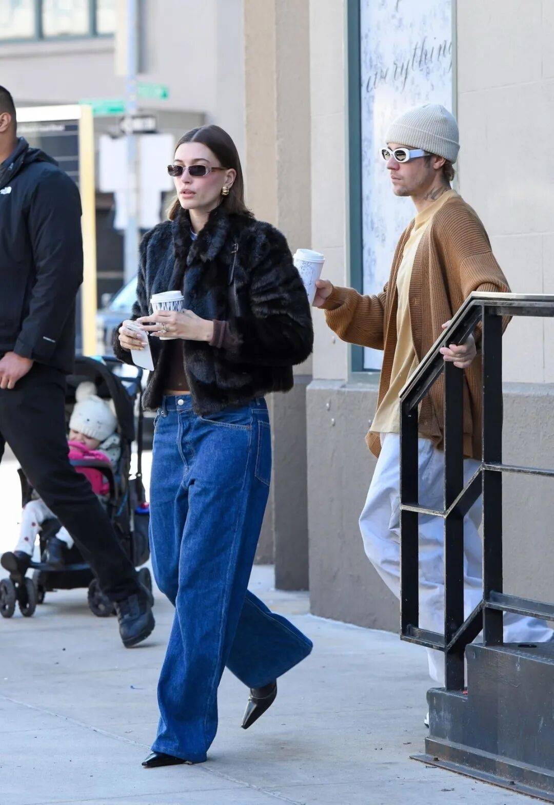 内搭一件针织衫与高腰直筒裤,用利落的现代线条巧妙平衡,整体显得精神而挺拔。