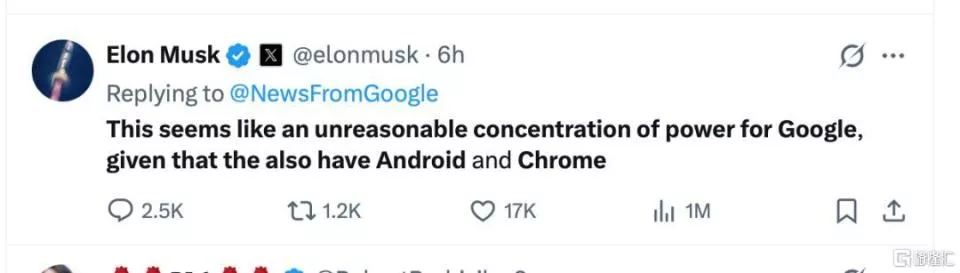 马斯克直接发推开炮:考虑到Google已经拥有Android和Chrome,这似乎是一种不合理的权力集中。
