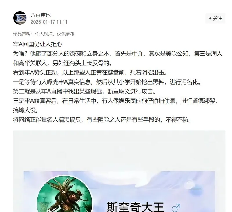 有网友担心,牢A回国并不代表真正安全,这些被断掉财路的人,可能会采取以下手段——或等待有人曝光牢A真实信息,或从其小学开始挖出黑料,进行污名化。或从牢A直播中找出某些瑕疵,断章取义进行攻击。或在日常生活中,像娱乐圈的狗仔偷拍偷录,进行道德绑架,搞垮人设。
