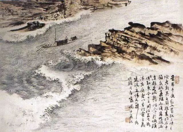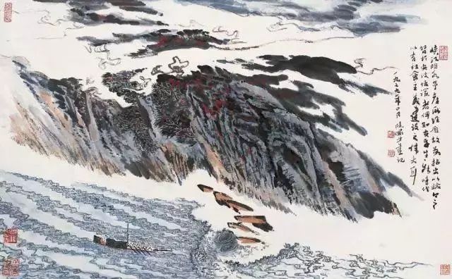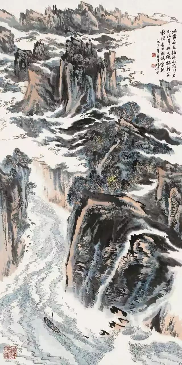 1938年,抗日战争全面爆发,陆俨少举家避乱入蜀。几年间,他饱游蜀中名山大川。特别是抗战胜利后东归,他买不起船票,只得乘木筏顺江而下,在一个多月的行程里,险象迭出,九死一生,留在脑中的印象丰富深刻。陆俨少以三峡之水为描绘对象,经过高度提炼和概括,形成了独具一格的表现激流和漩涡的方法,“陆家山水”初见端倪。