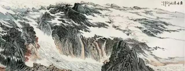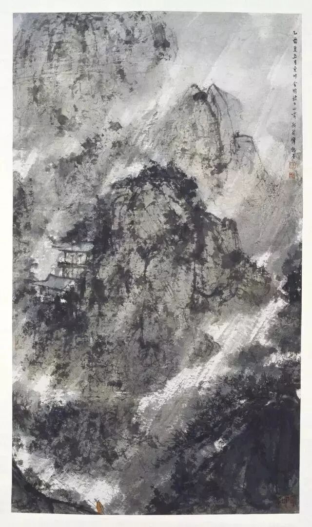 陆俨少的山水画,其传统笔墨功力自不用说,其形式、构图更有独到之处。尤其是那巴山蜀水、峡江巫云的奇绮变化,通过他的多种笔墨技法的探索,终于使他的创作突破性地进入一个新的表现层次。尤其是当他70岁左右,山水画的创作出现了传统表现技法上少有的勾云、留白、墨块等画法。这些新的表现手法,不但是他山水画变法的标志,更是形成他独特风格的重要转折点。