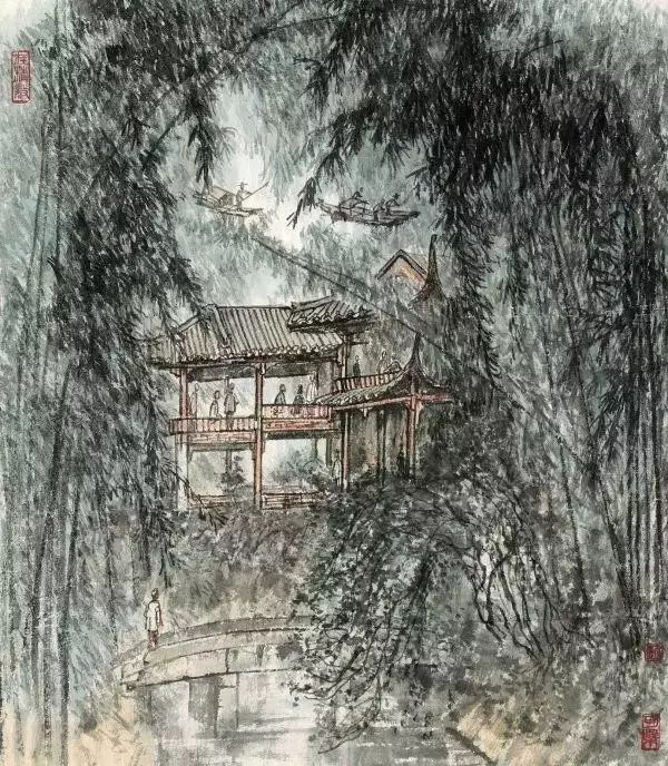 傅抱石1944年作于金刚坡下的《万竿烟雨》,就是他在“外师造化,中得心源”的美学原则指导下,深入观察川东的自然景象,加以提炼升华,使理性的概括和感情的抒发相结合创作出来的典型艺术作品。这幅《万竿烟雨》正可谓傅抱石得山水性情的绝妙佳作。