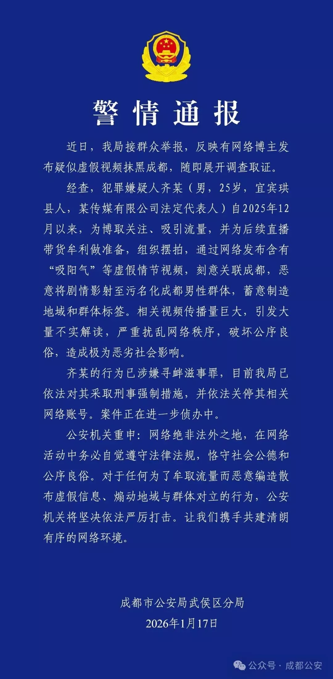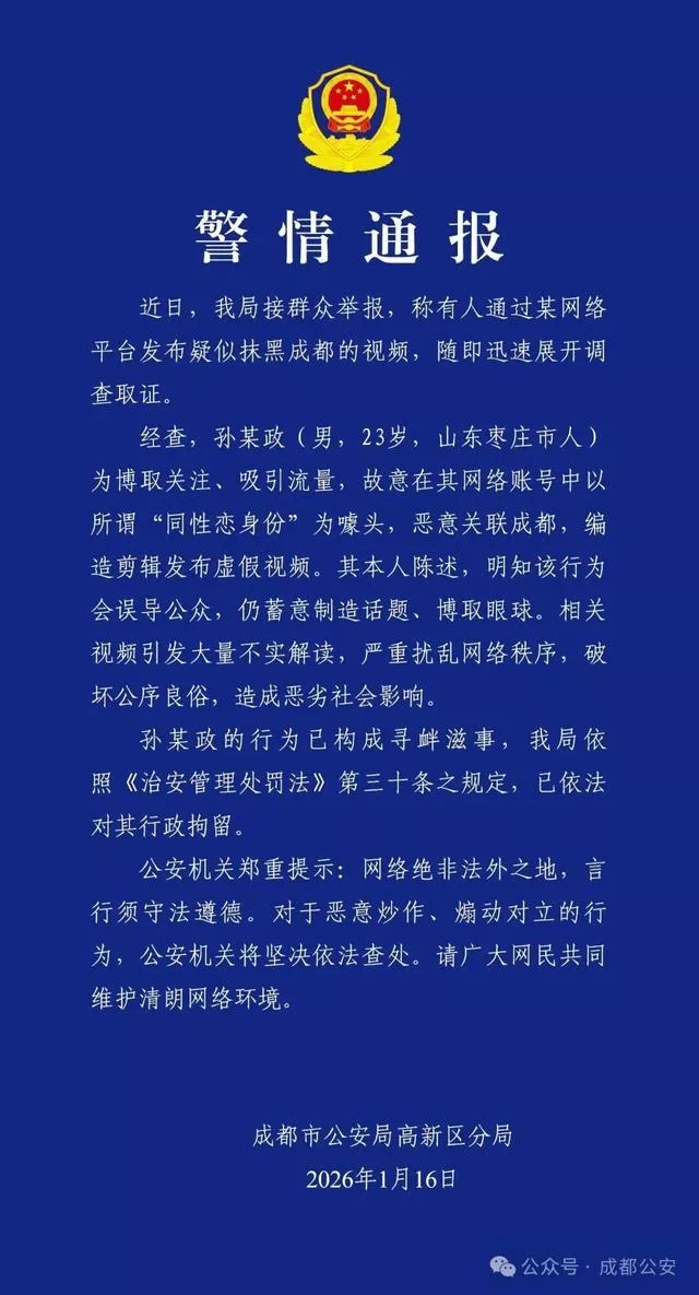 1月17日,微信公众号“成都公安”发布通报: