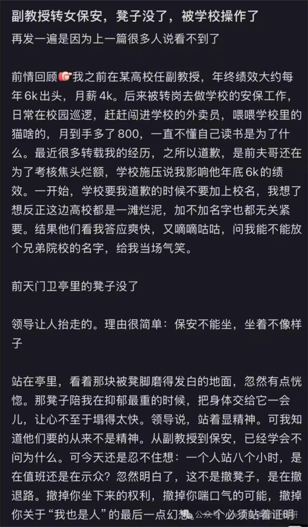 结果现实翻脸很快。因为没完成学校的考核要求,被要求转岗,最后安排到了保安岗位。还有说法是,如果要离职,需要退还一百万元的安家费。