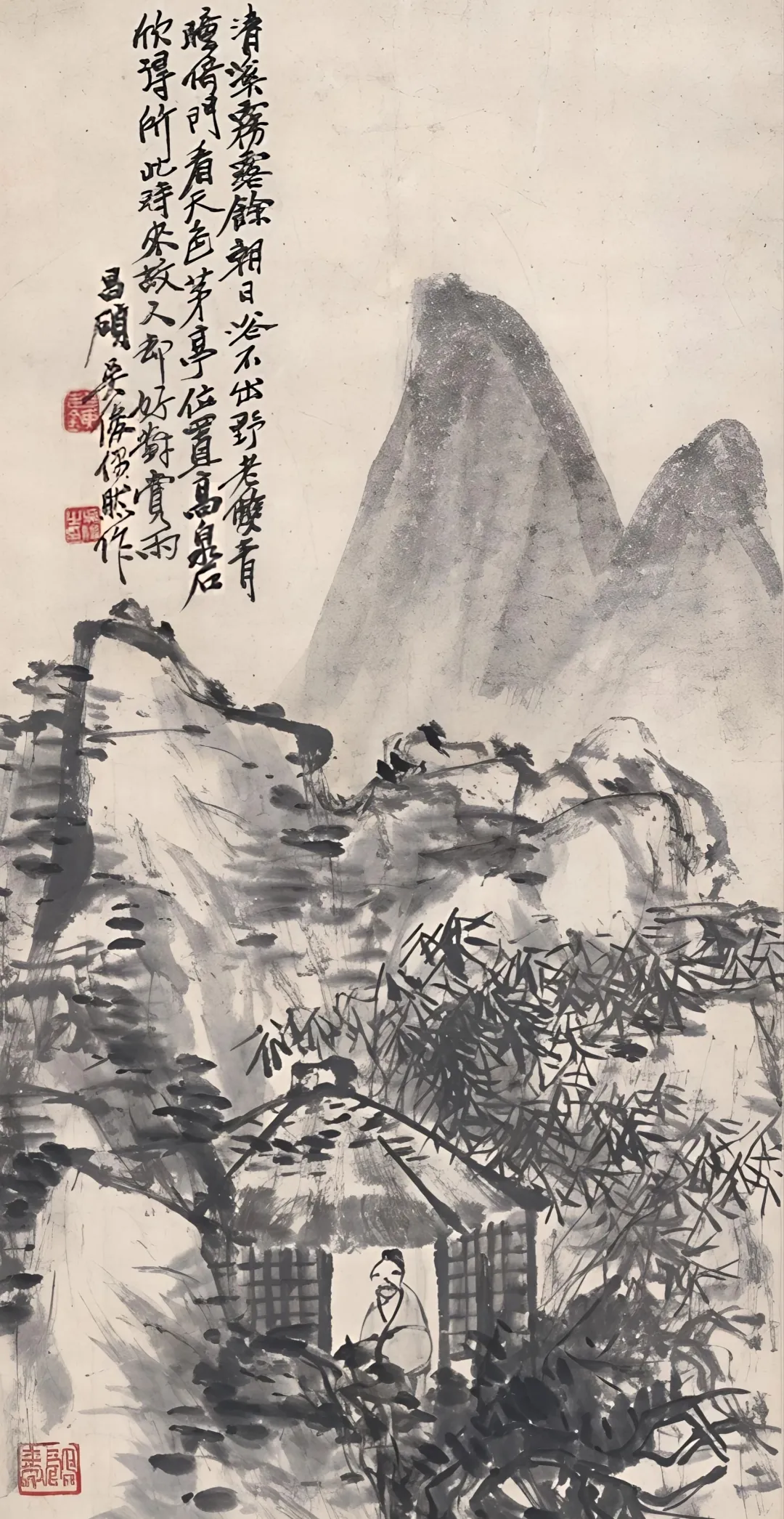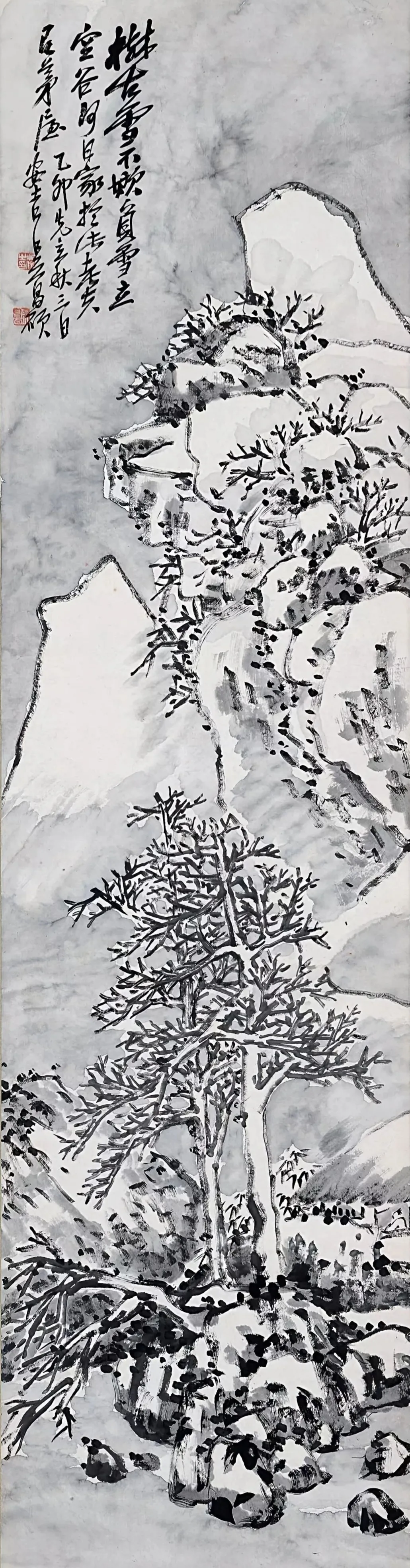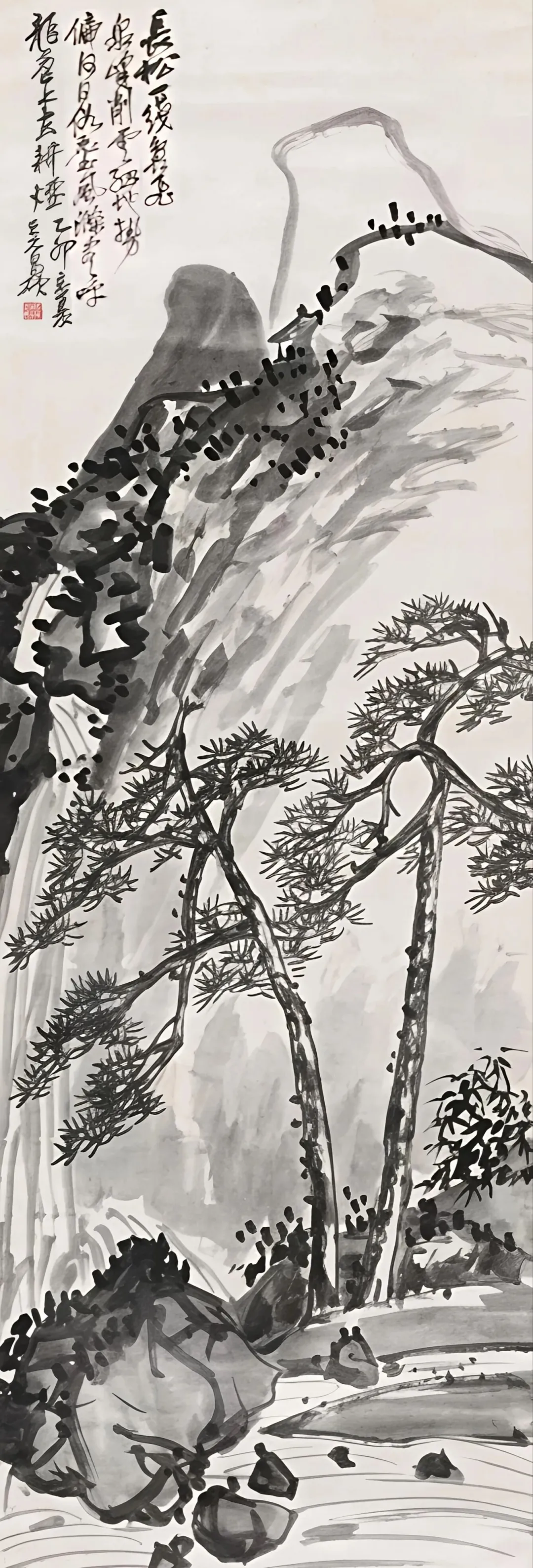 他大胆使用泼墨与焦墨对比,墨色在滂沱与干渴之间,产生如青铜器般斑驳陆离、浑沌初开的肌理效果。以至形成了其山水“重、拙、大”的鲜明特色:“重”是精神与笔力的千钧之重;“拙”是褪尽巧媚、返璞归真的大巧之拙;“大”是格局气象的吞吐大荒。