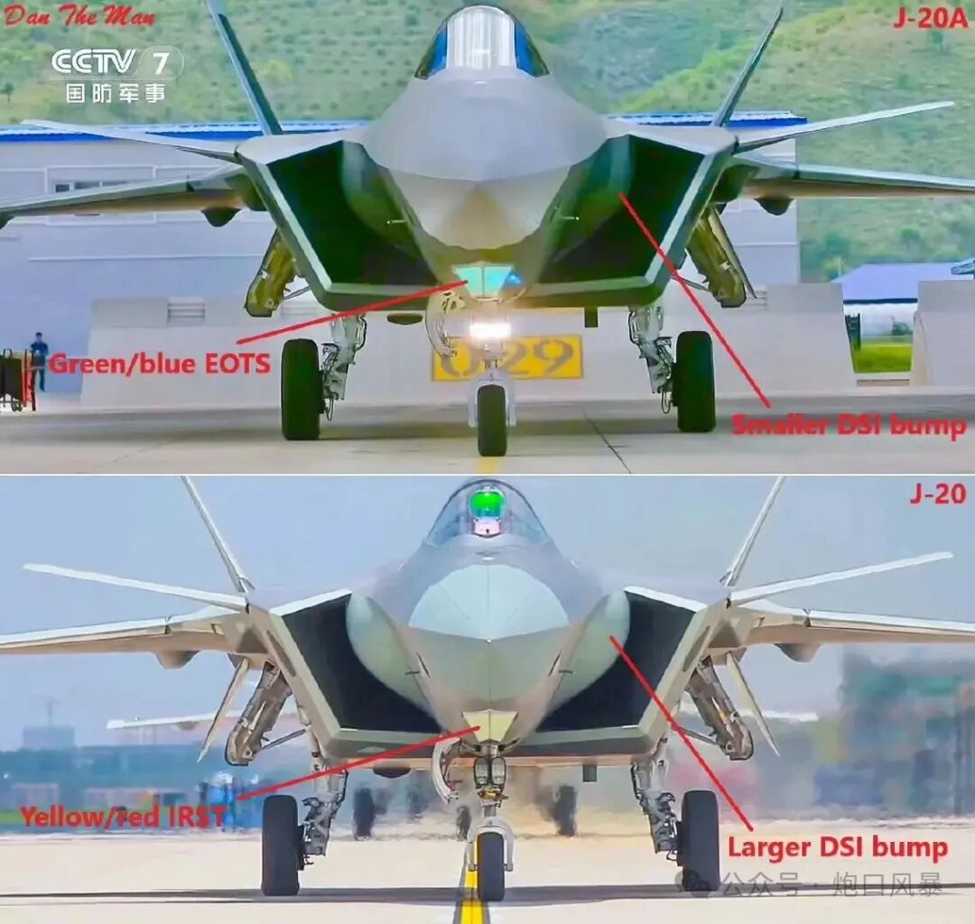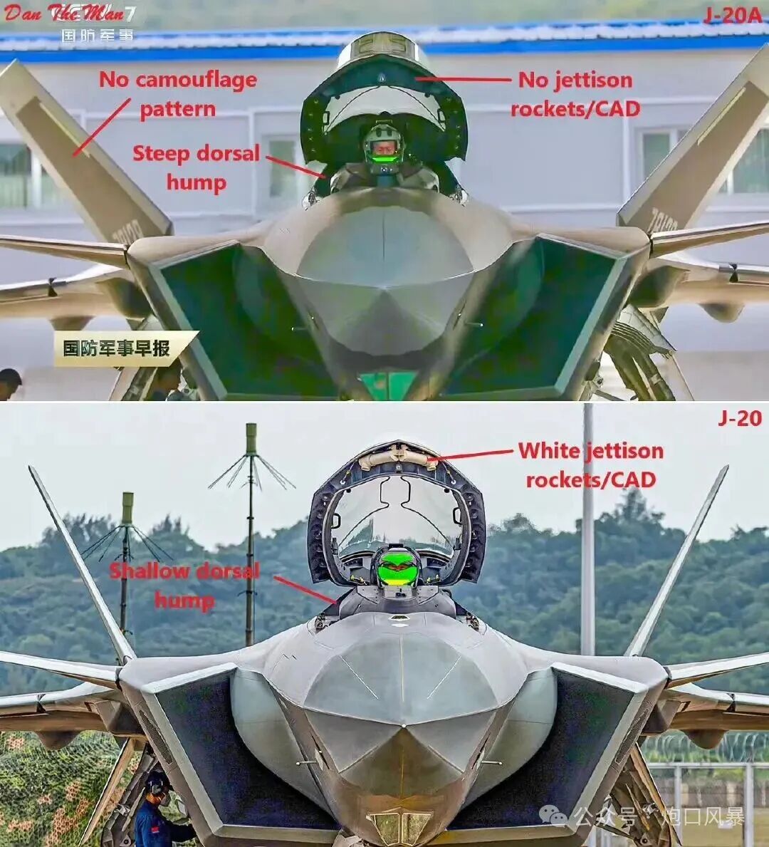 歼-20A跟基础款歼-20的差别,从外观到核心配置都能一眼看出来。首先是机背多了个“鼓包”,歼-20A的“脖子”更粗,座舱盖和机身衔接更顺滑,能减少超音速飞行的阻力,还能塞更多航电设备;DSI进气道的鼓包也更小,气动效率更高。