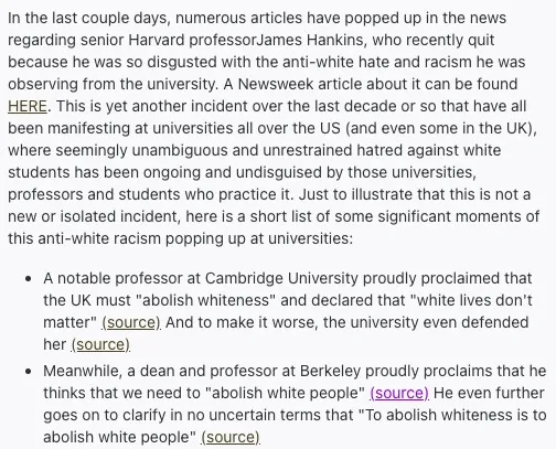 Reddit上有网友指出,过去十年来,高校中频繁出现针对白人的种族歧视和仇恨行为,比如:“华盛顿大学存在刻意拒绝聘用白人候选人的做法,其多元化咨询委员会迫使招聘委员会给候选人重新排序,以便让一名黑人女性获得职位。