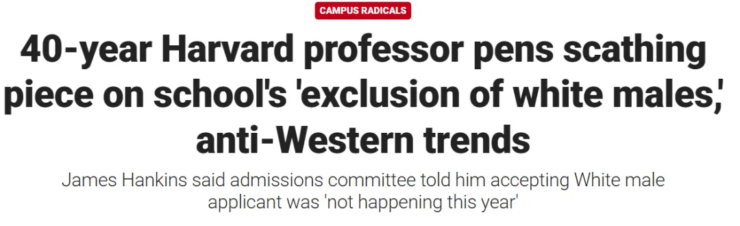 随后他提到了在招生过程中的歧视现象。在审阅2020年秋季研究生申请时,Hankins教授称自己遇到了一位非常优秀且与项目匹配的候选人。如果是过去的几年里,这位候选人会立即脱颖而出。然而2021年,招生委员会的一名成员私下告诉自己,“今年不会录取白人男性。”