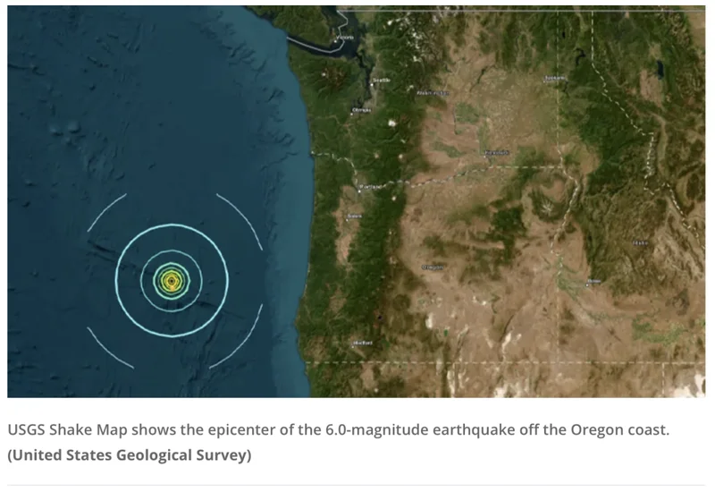周四晚上 10 点 25 分,美国地质调查局监测到一场 6.0 级地震,震中位于 俄勒冈州外海约 180 英里处。虽然震源深埋海底,但震波沿着板块边界高速传播,波特兰、尤金、塞勒姆、库斯湾等城市都出现明显震感,甚至 300 英里外的居民都感觉房屋轻微摇晃。