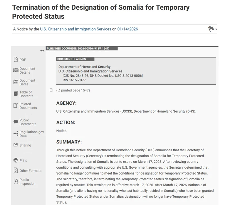 就在同一天,美国国土安全部宣布,将终止对索马里移民的临时保护身份(Temporary Protected Status,TPS)。这一系列表态与政策调整,正值川普政府在明尼苏达州展开大规模调查与执法行动之际。