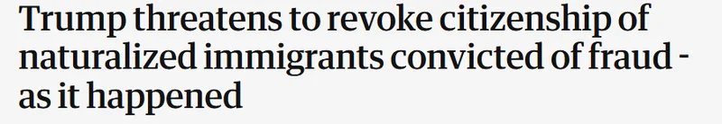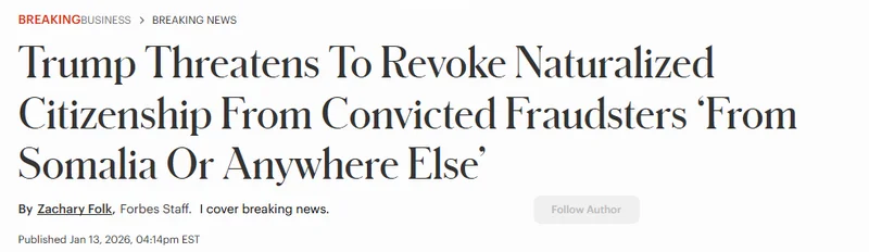 美国总统川普表示,若已入籍美国的公民被判定存在欺诈行为,将被撤销公民身份,“不论来自索马里还是其他任何地方”。