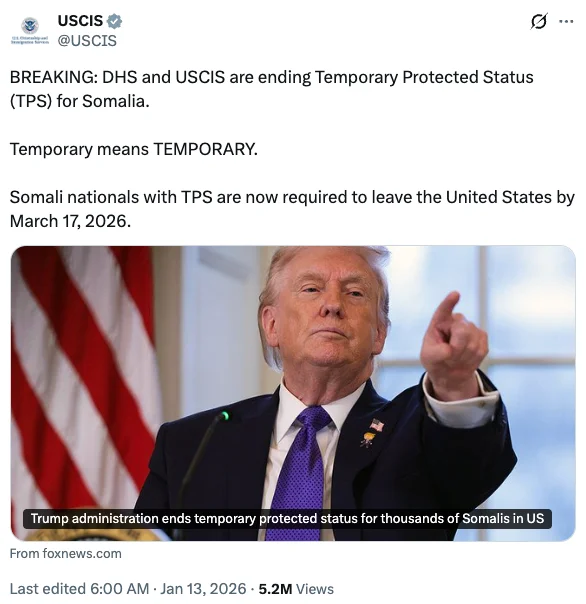 同日,美国国土安全部长诺姆(Kristi Noem)在接受采访时表示,索马里的“国家状况已有改善”,因此其公民将不再符合申请TPS的条件。随后,DHS在社交媒体上证实该决定,并直接向持有该身份的索马里人喊话,要求其返回原籍国,否则将被遣返。