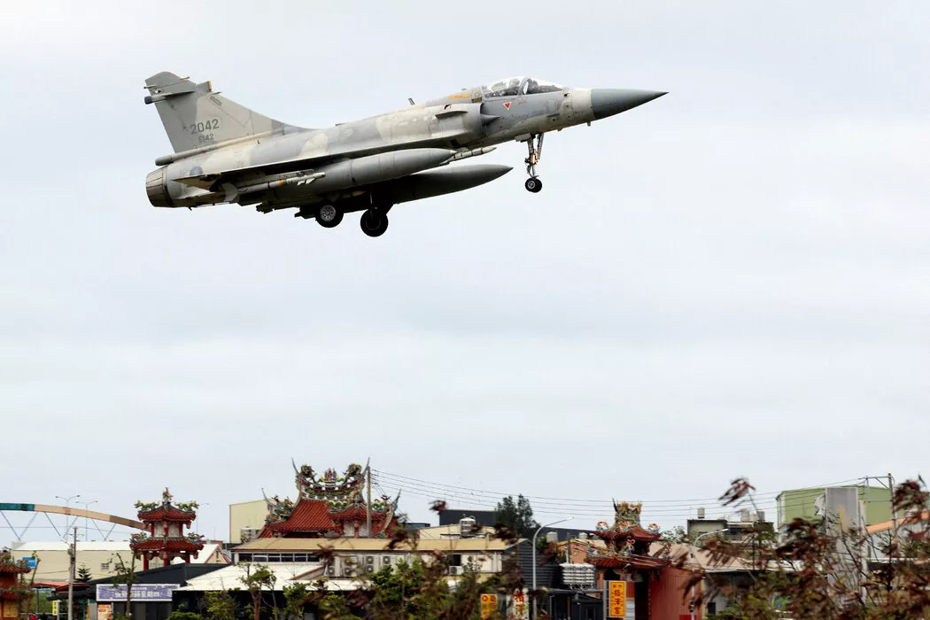 中国在该地区举行军事演习期间,一架台湾战斗机准备降落。