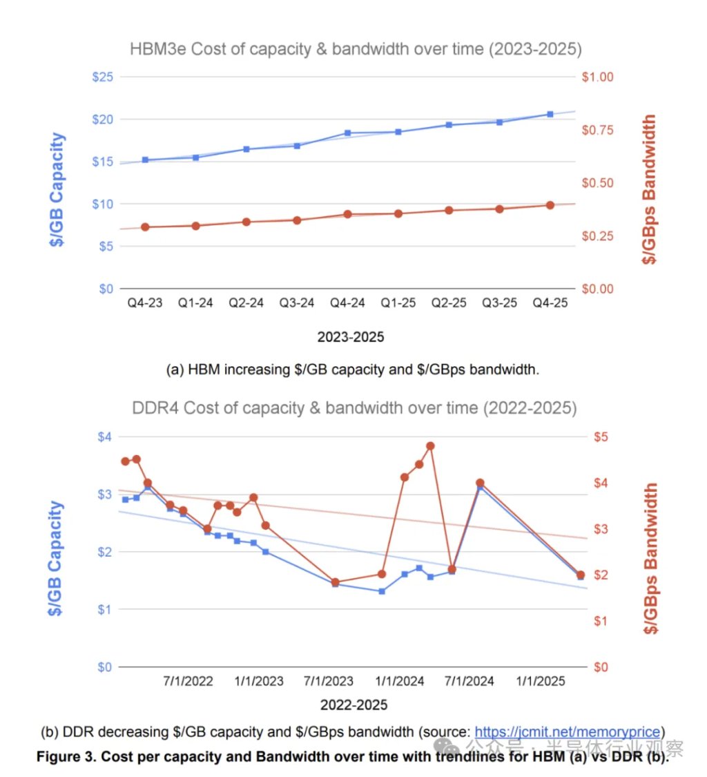 以单个 HBM 堆栈为例,其容量(美元/GB)和带宽(美元/GBps)的标准化价格均随时间推移而上涨。图 3(a) 显示,从 2023 年到 2025 年,两者的价格均增长了 1.35 倍。这一增长是由于随着每个 HBM 堆栈芯片数量的增加以及 DRAM 密度的增长,制造和封装难度也随之增加。相比之下,图 3(b) 显示,标准 DDR4 DRAM 的等效成本随时间推移而下降。从 2022 年到 2025 年,容量成本降至 0.54 倍,带宽成本降至 0.45 倍。尽管由于意外的需求,所有内存和存储设备的价格在 2026 年大幅上涨,但我们认为,从长远来看,HBM 和 DRAM 价格走势的分化趋势将持续下去。