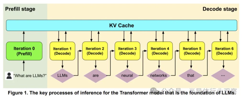 LLM的核心是Transformer,它包含两个特性截然不同的推理阶段:预填充(Prefill)和解码(Decode) (图1)。预填充类似于训练,它同时处理输入序列中的所有标记,因此本质上是并行的,并且通常受限于计算能力。相比之下,解码本质上是顺序的,因为每个步骤都会生成一个输出标记(“自回归:autoregressive”),因此它受限于内存。KV(Key Value)缓存连接这两个阶段,其大小与输入和输出序列的长度成正比。尽管在图1中预填充和解码同时出现,但它们并非紧密耦合,通常运行在不同的服务器上。分解推理允许使用批处理等软件优化方法,从而降低解码过程的内存占用。一项关于高效LLM推理的调查回顾了许多软件优化方法。