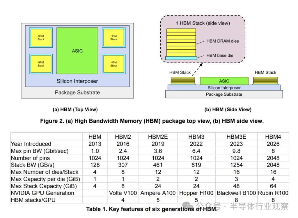 目前的数据中心 GPU/TPU 依赖于高带宽内存 (HBM),并将多个 HBM 堆栈连接到单个单芯片加速器 ASIC(图 2 和表 1)。然而,内存带宽的提升速度远低于计算浮点运算能力 (FLOPS) 的提升速度。例如,NVIDIA 64位GPU的浮点运算性能